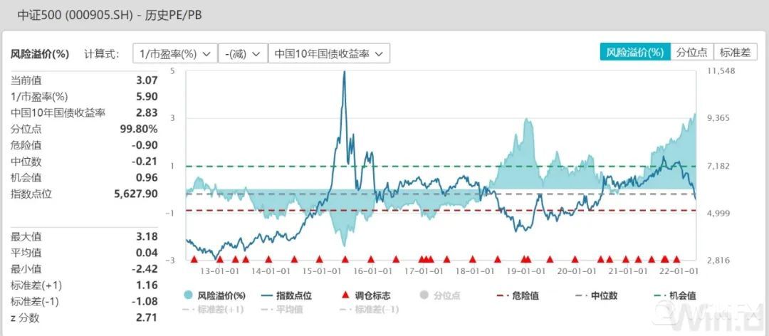 从风险溢价水平看,中证500指数当前时点的风险溢价率(1/市盈率 减去 中国10年国债收益率)为3.07,处于过去10年99.80%的分位点,具有非常高的风险溢价性价比。