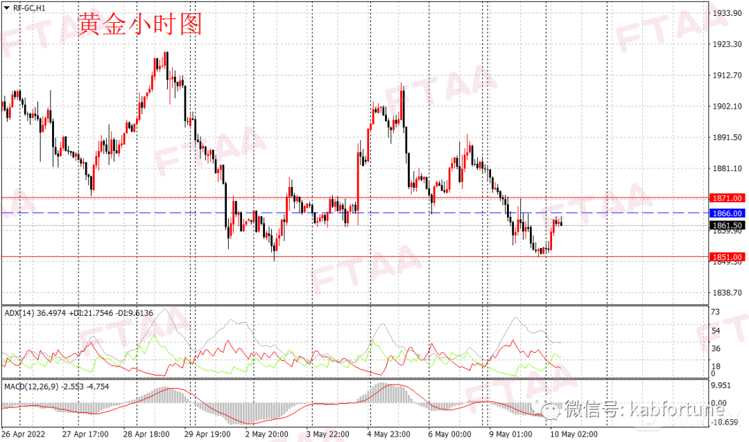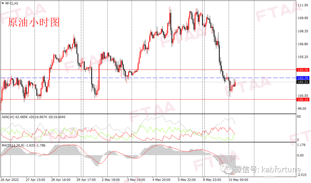 原油周一大幅下跌,最高110.39,最低102.11,日图收出长阴线,显示空头大幅发力,日图级别弱势或延续。昨日欧盟暂时搁置了禁止俄罗斯原油进口的计划,但美股大跌和全球金融市场动荡打击原油多头情绪。油价亚盘稍作反弹后,欧美盘时段陡峭下跌。当前小时图一笔下跌力度大,ADX指标高位,短线或延续偏空,今早亚盘油价维持震荡,操作上可持有空单,或逢高在102.70附近轻仓空,止损103.70,目标100.10。