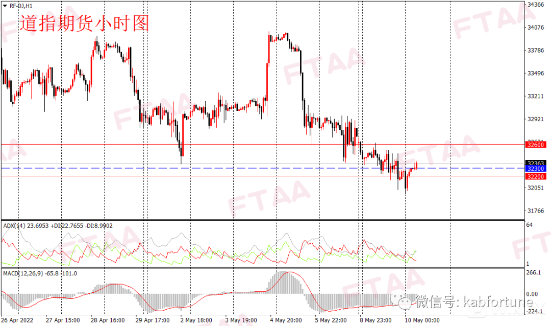周一美股三大指数大幅下跌,纳指跌超4%,道指跌653点或1.99%。昨日两美联储官员再度发表偏鹰言论,市场担心激进紧缩可能导致经济衰退,此外美联储半年度金融稳定报告亦警告称金融市场流动性正不断恶化。投资者在恐慌中继续抛售头寸。道指低开震荡收低,日图收出中阴线,显示短期空头继续发力,日图级别维持偏空。道指期货方面,昨日全天震荡下行。今早亚盘道指期货再度下探后,小级别震荡指标背离,当前反弹。短线或维持震荡略偏多。操作上可观望,或逢低在32300附近轻仓多,止损32200,目标32600。