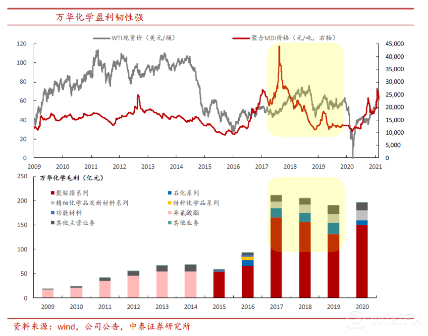 万华化学2016年至今,形成了聚氨酯、石化、新材料三大产业链,在MDI(二苯基甲烷二异氰酸酯)领域成为全球龙头。过去五年,公司有约74%的毛利由聚氨酯贡献。尽管在此期间MDI价格大幅波动,公司聚氨酯板块毛利率始终维持在40%以上的水平。2020年公司把握全球需求复苏契机,一至第四季度业绩逐季向好,全年实现归母净利润100.41亿元,同比下降0.87%,公司盈利韧性凸显。