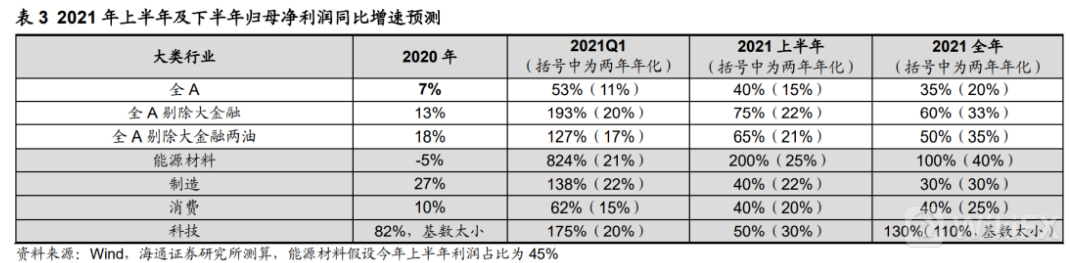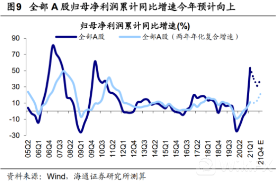 而根据已经公布的工业企业利润,海通证券预计全A归母净利润同比增速上半年为40%(两年年化15%),2021年全年为35%(两年年化20%);全A剔除金融后上半年归母净利润增速如前所述为75%(两年年化22%),21年全年归母净利润增速为60%(两年年化增速33%);全A剔除金融两油后的归母净利润增速上半年为65%(两年年化21%),2021年全年为50%(两年年化35%)。因此从基本面的角度前瞻,下半年市场有望继续向上。