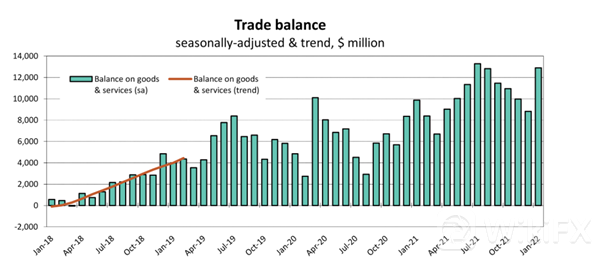 澳元的商品货币属性将有利于支持澳元。最近两年随着一轮大宗商品牛市的到来,澳大利亚资源出口受益巨大,商品贸易盈余创下了历史记录。最新的数据显示,澳大利亚今年1月份商品贸易盈余到达了129亿澳元,为历史第二高的水平。在全球通胀严重的时期,背后有自然资源支撑的货币被自然会被视为抗通胀的“硬通货”。