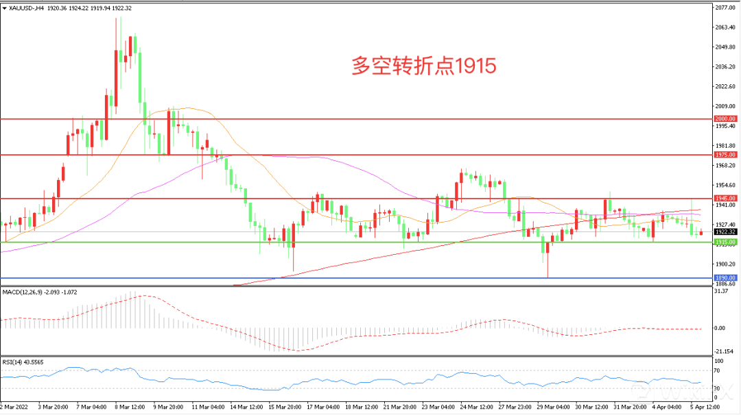 4小时图看,金价触碰1945一线后再度回落,区间震荡迹象明显,均线系统走平,MACD绿柱缩短,RSI指标走平,日内延续震荡概率较大。