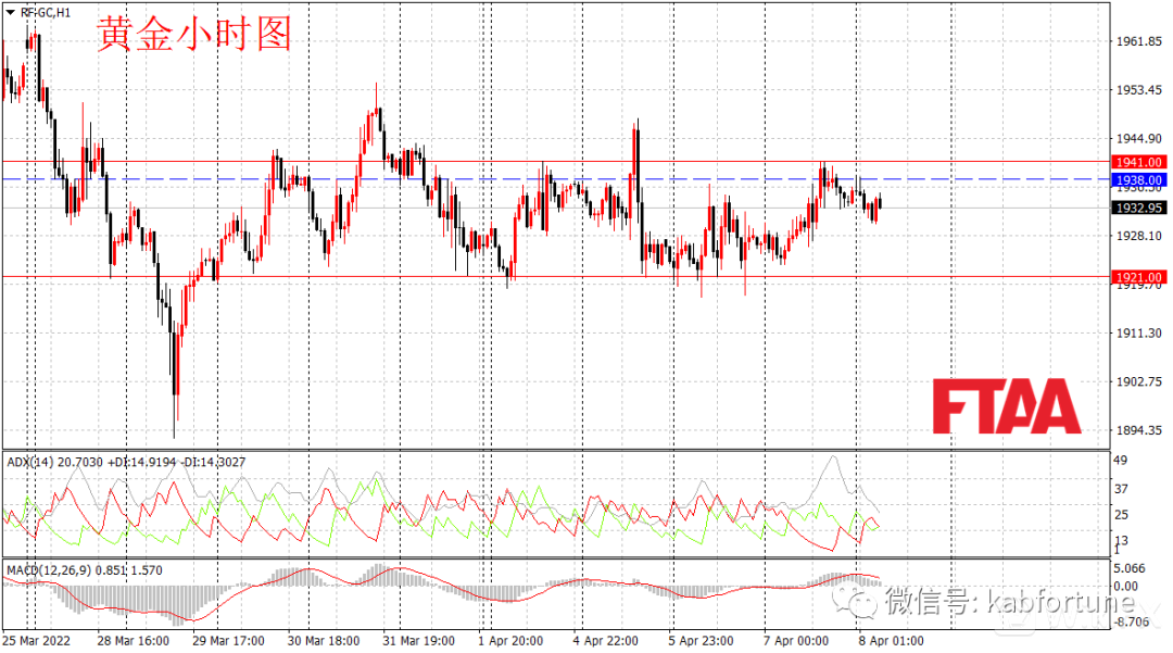 黄金期货周四上涨,最低1923.05,最高1941,日图收出小阳线,现实短期多头占优,但当前MACD指标贴近0轴运行,ADX指标低位,金价日图级别整体或维持震荡。小时图看,昨日亚盘开盘调整后,欧美盘时段震荡回升,美盘后段美股反弹,避险情绪回落,金价调整。日内或延续震荡。今早亚盘金价小幅调整,操作上可现价附近,或逢高在1938附近轻仓空,止损1941,目标1921。