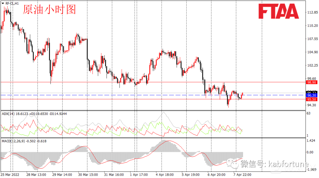 原油周四进入震荡,最高98.78,最低93.81,日图收出十字星,显示短期多空平衡。但日图级别整体维持偏空。昨日油价亚欧盘维持震荡,美盘时段美国宣布禁止俄罗斯能源进口的消息,叠加美股下行打压原油,油价一度创出短线新低。当前MACD指标有背离迹象,今早亚盘油价下探后当前反弹,操作上可观望,或逢低在96.30附近轻仓多,止损95.50,目标98.90。