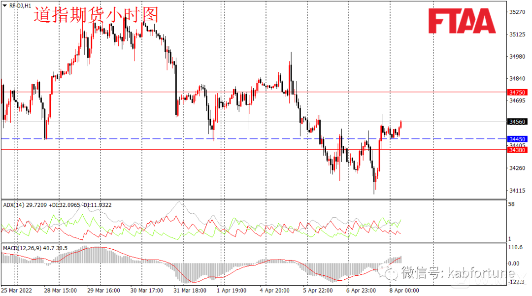 周四美股三大指数小幅收涨,道指涨87点或0.25%,美联储官员及鹰派的会议纪要后继续放鹰,同时俄乌危机持续发酵,道指盘中低开低走,但午盘震荡走高。日图收出下影小阳,显示短期下方支撑明显,日图级别或维持震荡略偏多。道指期货方面,昨日亚欧盘震荡反弹,但美盘早段跳水创出新低,随后快速拉回,小时图底背离迹象明显,日内或延续震荡盘升。今早亚盘道指期货震荡后当前上涨,操作上可现价附近,或逢低在34450附近轻仓多,止损34380,目标34750。