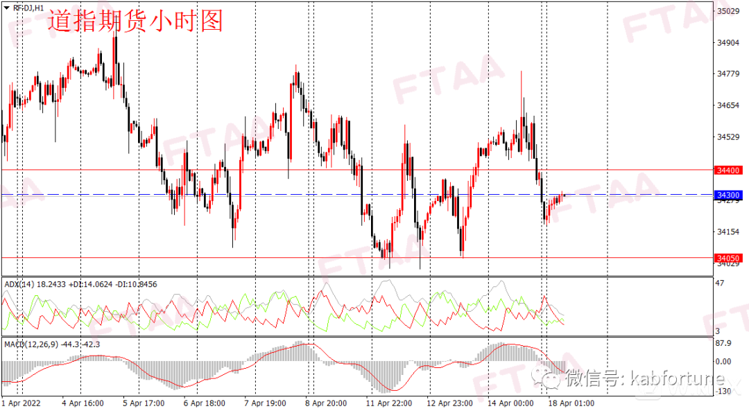 周五美股因假期休市,而此前一天三大指数高开低走,道指日图收出上影中阴,显示上方阻力明显,纳指则将此前一日的阳线反包,整体美股形态偏空。周末俄乌紧张局势升级,俄称完全控制马里乌波尔,同时加大对乌的导弹袭击,打击风险情绪。道指期货在周四美盘冲高回落后,今早亚盘低开下行。日内或延续弱势震荡。操作上可持有空单,或现价附近轻仓空,止损34400,目标34050。