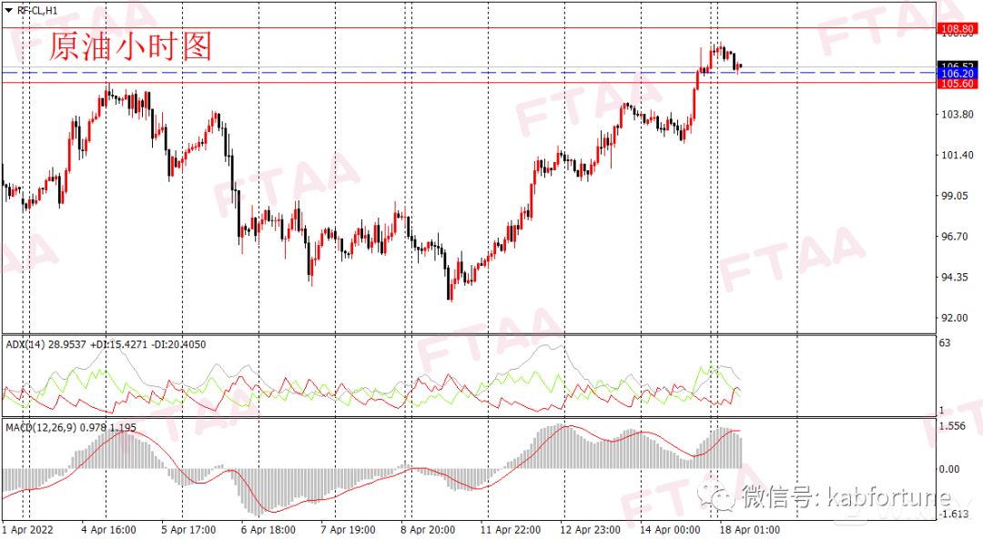 原油上周四延续小幅上涨,日图收出小阳线,显示多头继续主导,价格继续站上短期高点,日图级别或维持偏多。小时图看,油价在周四亚欧盘震荡回落,美盘时段持续上涨。周五至周末外围消息对油价偏多,俄乌局势紧张升温,利比亚原油减产的因素提振油价今早亚盘高开走高。当前ADX指标升高,MACD指标红盘运行,日内或延续强势震荡,今早亚盘油价冲高后当前回落。操作上可逢低在106.20附近轻仓多,止损105.60,目标108.80。