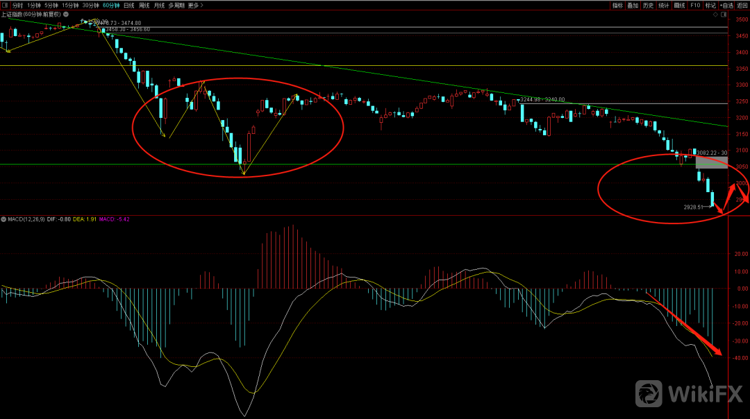 大盘跳空向下出现加速下跌走势,短期需要注意下方的前期缺口2855,有可能会出现回补走势。重点关注六十分钟的止跌信号,短期由于下跌的走势相对较急可以耐心等待日线macd量柱出现企稳信号再考虑入场。而从时间周期看下一个变盘点大概率会出现在五一过后,从六十分钟结构看这边如果出现再次的反弹需要注意把控好节奏点。