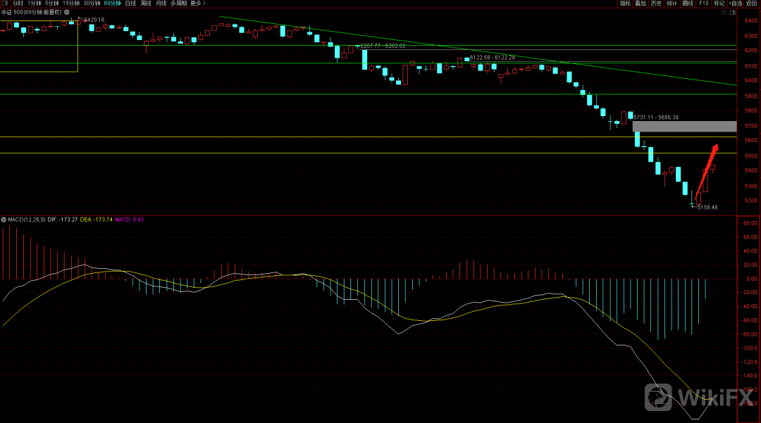 中证500出现反弹走势,而由于六十分钟的脱离段较为长一些,大概率会有三卖的结构出现,届时将会有再次的回落走势。注意中枢形成后的量能变化。