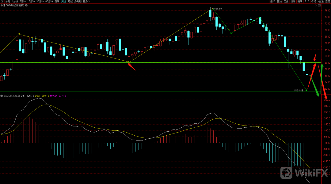 中证500短期注意日线macd量柱的变化,在没有缩短之前大概率还能延续反弹走势,从周线看这边的反弹如果能够延续大概率能反抽到5900点附近,在这个位置大概率还会有再次的回落走势,而周线收盘需要注意是否出现跌破5600点如果出现大概率还会有新低的可能。
