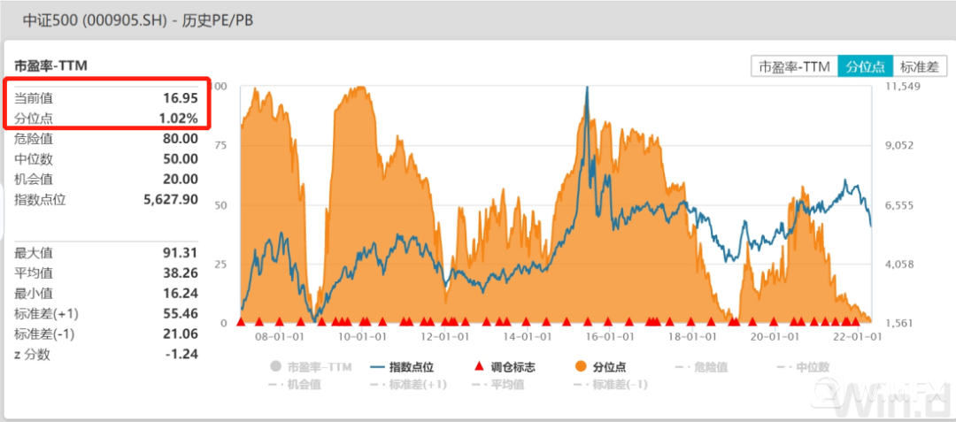 如上图,截至4月末,中证500市盈率-TTM为16.95,处于历史上1.02%分位点,已经处于非常低的估值水平。