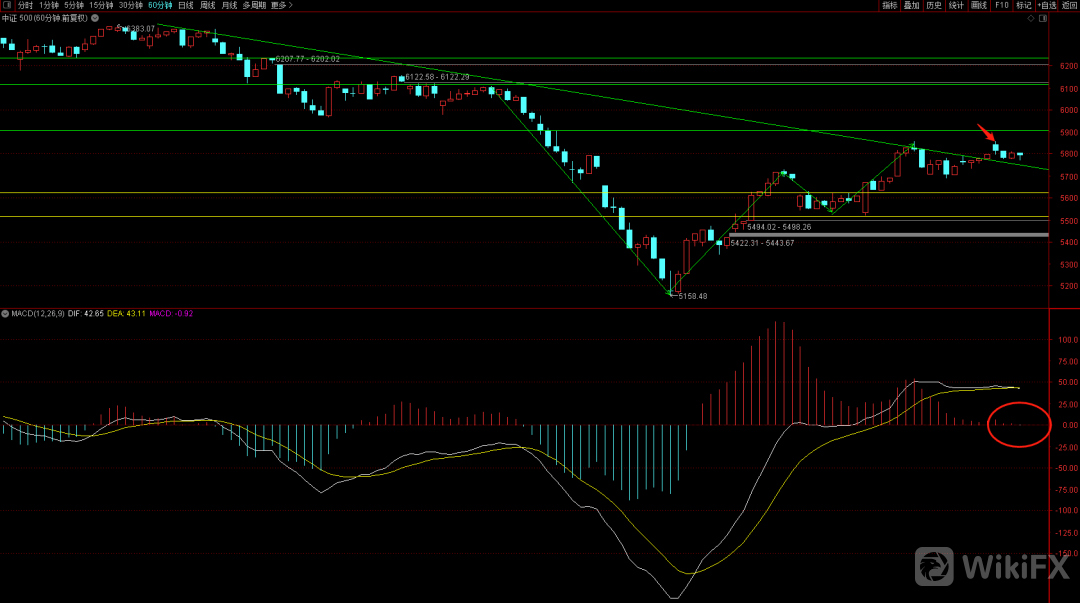 中证500弱势突破六十分钟的下降趋势线,短期关注5680附近的支撑一旦跌破就有概率回落到5500附近由于小级别结构呈现混乱状态,反弹大概率无法非常顺畅,注意高抛节奏点。