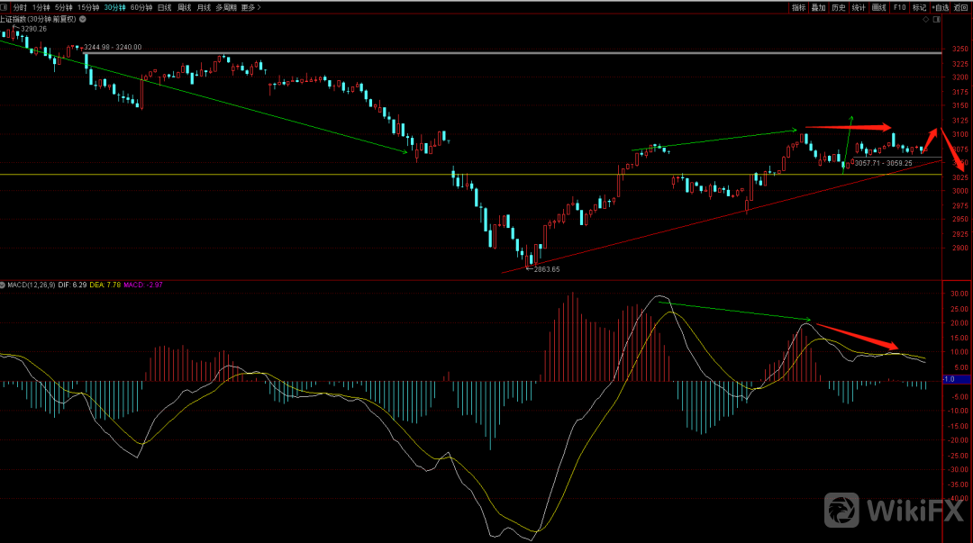 大盘高开后出现五分钟与十五分钟顶背驰后出现再次回落,短期离下方缺口仅仅一步之差,关注三十分钟的上升趋势线是否会被跌破,在没有跌破之前还有机会再次上冲一次。届时构筑多重顶背驰结构再次回落,而下方支撑需要关注2975附近。而如果想要新低则需要跌破2940方有这个概率。