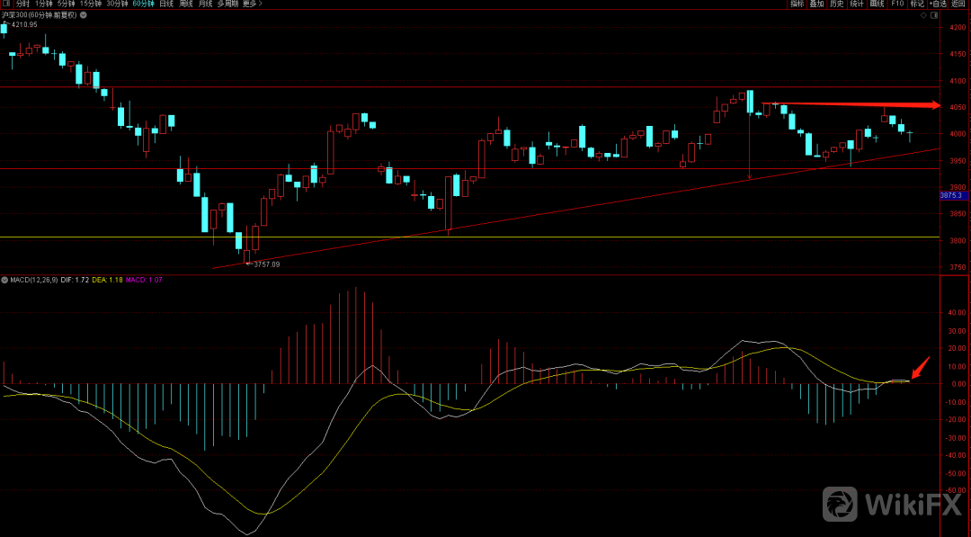 沪深300在我们前面提到的4050附近遇到压制,目前六十分钟结构的反抽有结束迹象注意观察3933点支撑,如果出现跌破则下跌将出现扩张的可能,届时需要关注前期平台中枢下轨3800附近的支撑。