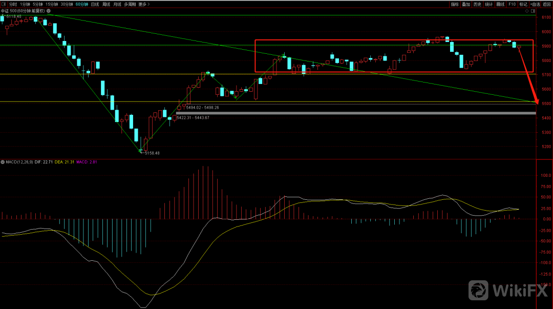 中证500目前六十分钟的盘整结构已经运行了13天,如果没有办法在短期出现选择强势向上的话,出现再次向下去试探5500的可能性将出现增大。而上方只有突破到6300之上才有脱离平台的可能,否则还是会有再次回落的可能。