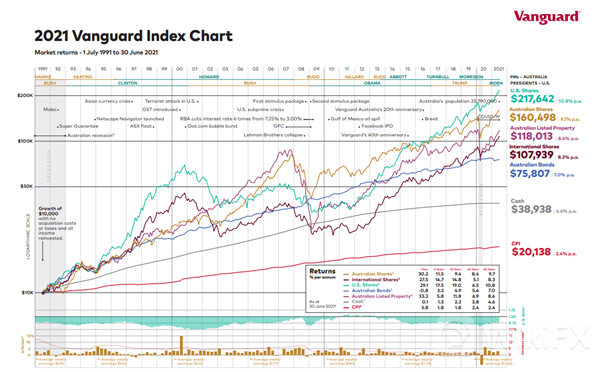 据美国最大基金管理公司之一的先锋领航(Vanguard)数据显示,如果在1991年时将$10,000投入不同资产,那么在20年后的2021年,这$10,000将会出现以下增长: