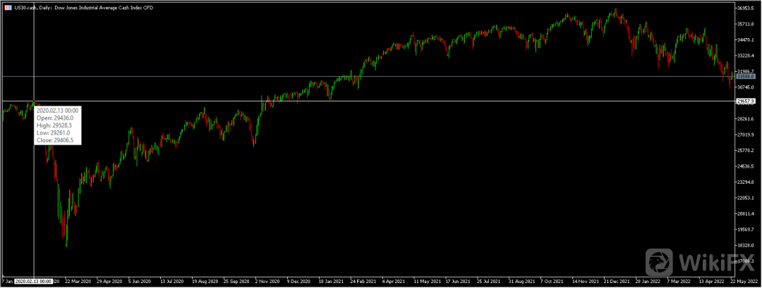 我们以美国道琼斯平均工业指数(US30)为例:受新冠疫情全球大爆发影响,该股指从2020年2月的29,500点左右出现大幅下跌,在1个月的时间里下跌至18,500点附近,跌幅高达37.28%,共计点跌11,000点。
