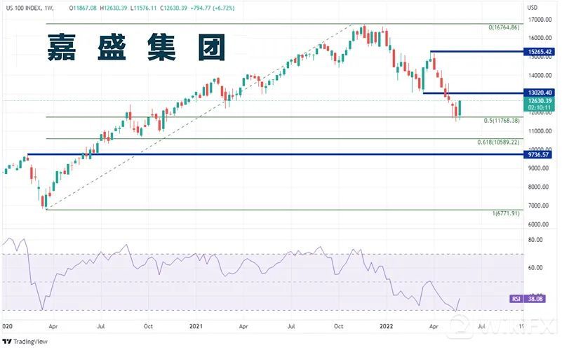 纳斯达克100指数在2020年3月23日当周的疫情期间最低到达6671.91,之后展开反弹,于2021年11月22日当周创下历史高点16764.86,涨幅超过147%。但随着通胀不似美联储所想属于过渡性质的事实越来越清晰,股指开始回撤,过去7周连续下跌。利率上升对股市来说可不是好消息。股指在上周回撤到2020年3月低点至2021年11月高点行情的50%回档位,期间一度跌破11768.38,但之后守住支撑位且实现了反弹,当周收高逾6.5%,还在周图上形成看涨吞噬K线,表明后市还有上涨空间。周图上的第一阻力位在13020.4,如果攻克,可望摸至3月28日以来高点15265.42、历史高点16764.86。第一支撑位在近期低点11492.29,然后是2020年3月低点至2021年11月高点行情的61.8%回档位10589.22。接着是2020年2月以来的水平支撑位9736.57。