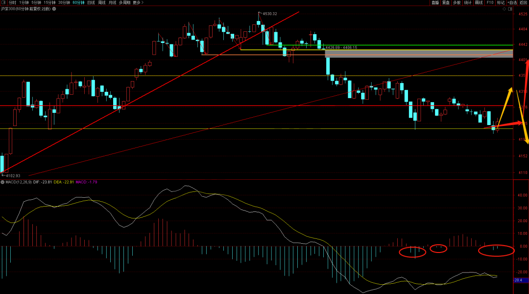沪深300短期六十分钟结构再次出现底背驰结构,注意这个位置是否会出现再次上扬,如果周一就继续上涨后续大概率还会有再次回落到走势,这个位置最好能够有个震荡走势在向上这样子就能够保持上涨的延续性,而上方关注4310点压制,如果能够突破则大概率会回补掉上方的缺口。