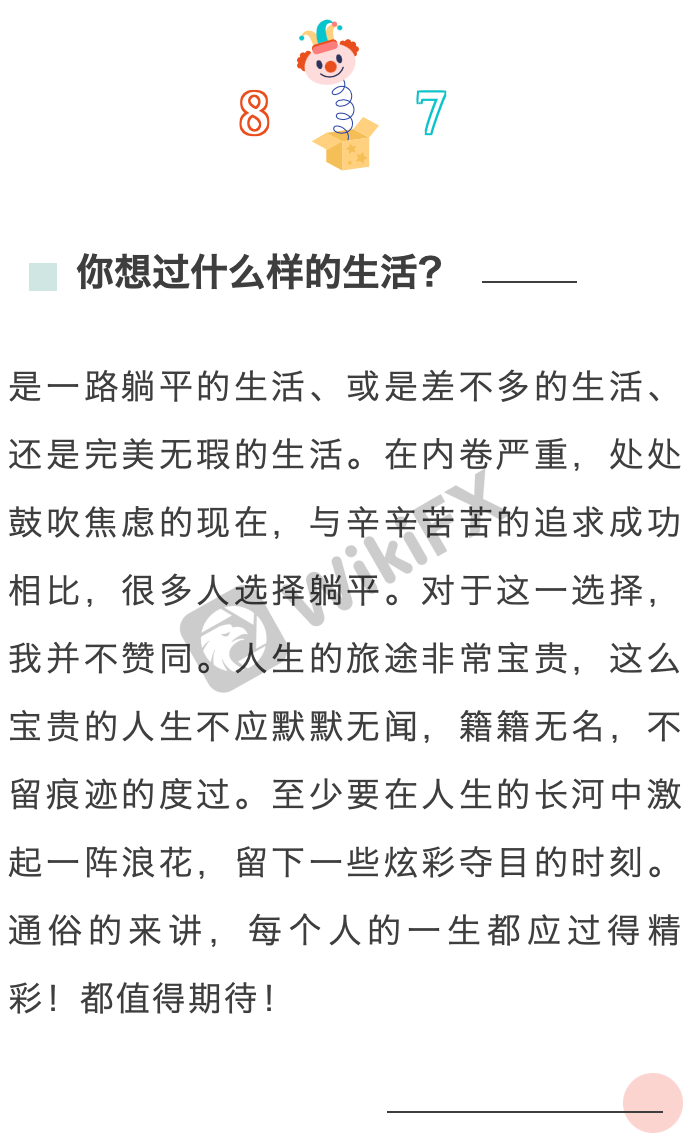 同时,要学会与时间做朋友,要学会安排规划个人的时间,不能让时间像指尖的沙土一样悄无声息的溜去,而要珍惜时间,善用时间,充分发挥每一份每一秒的效用。此外,要学会想象十年后的人生,用长远的眼光看待问题。要明白,无论身处顺境还是逆境,时间都在一如既往的向前走。取得一时的成功不要沾沾自喜,遭受一时的失败不可垂头丧气。而是要有一颗乐观向上的心态,敬畏时间,敢于谋划,不断努力。