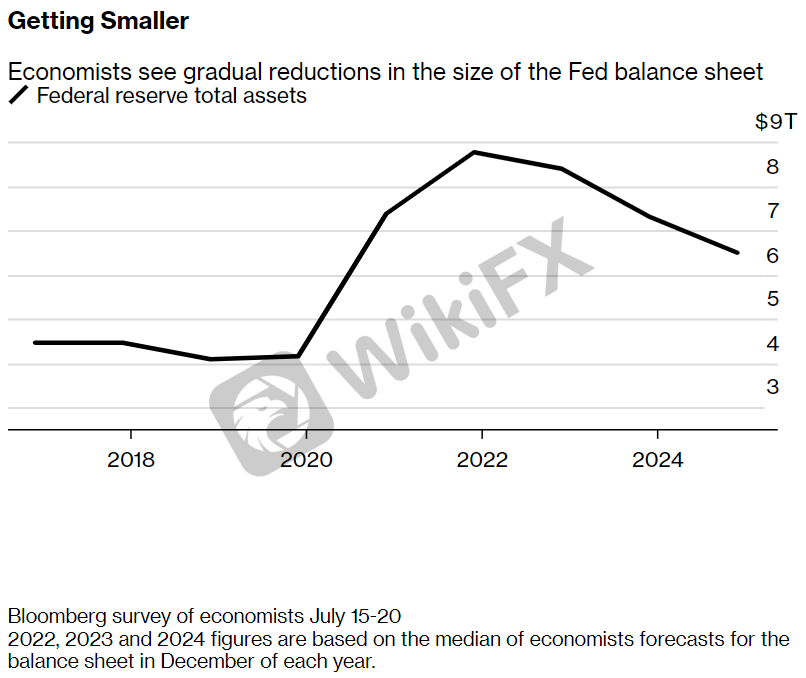 经济学家们预计,美联储最终将加大其缩表的力度,从今年6月开始,随着到期证券的流失。美联储正在逐步抛售资产,最终达到1.1万亿美元/年的规模。经济学家们预测,到年底时,美联储资产负债表将达到8.4万亿美元,到2024年12月将缩水至6.5万亿美元。