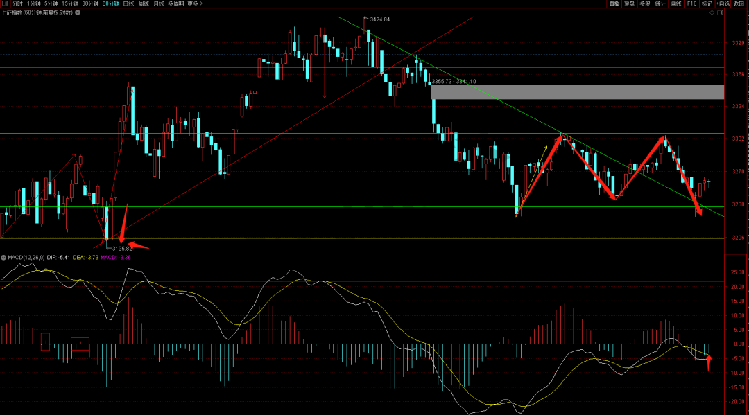 大盘早盘低开后在跌破了前期低点后出现快速拉升走势,短期需要关注是否构筑六十分钟底背驰结构,如果出现则有望向上回抽3275到3288区间压制,由于目前已经再次新低且二十天线压制也即将下移,注意观察日线macd是否出现扩张出现新一段下跌走势,从周期看大概率会在十号前后出现短期变盘点。