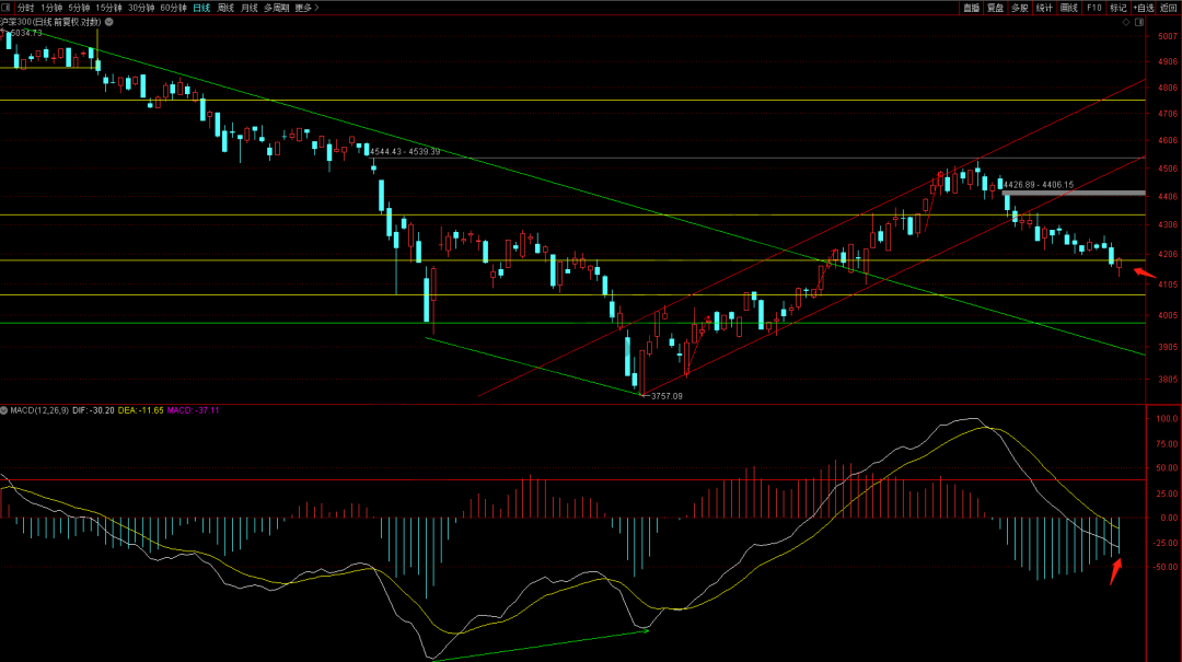 沪深300在临近4100点附近出现支撑后出现回抽,短期注意观察4188点关键位是否能够重新夺回,如果无法重新站上大概率继续延续下跌走势。