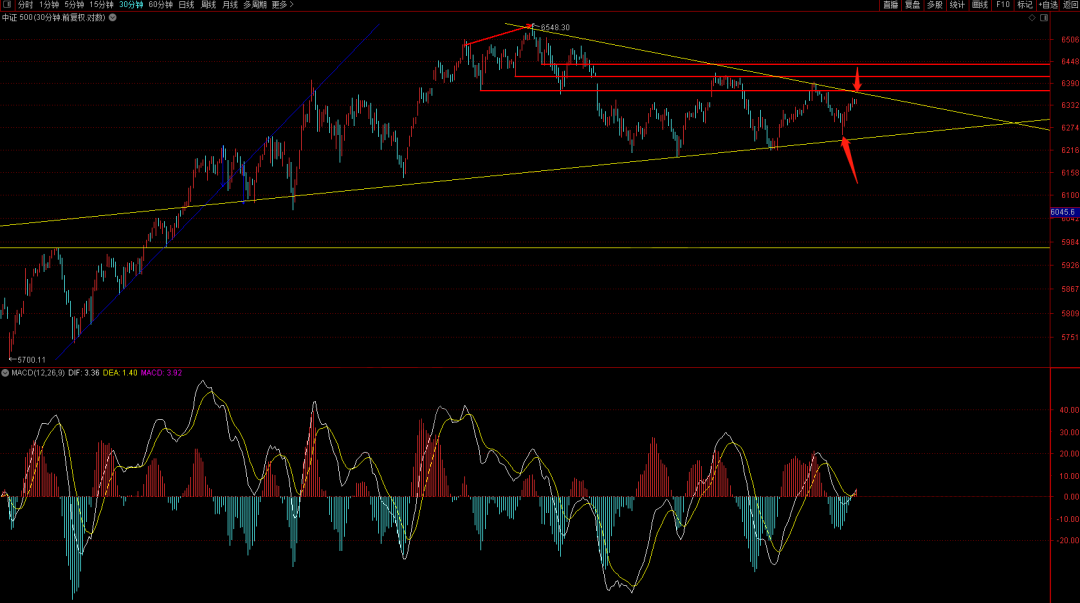 中证500表现略微强势,在收敛末端下沿附近遇到支撑后继续向上,短期已经再次来到收敛夹角上沿附近,注意观察是否能够出现突破,如果无法突破大概率会再次震荡向下维持收敛末端震荡结构。