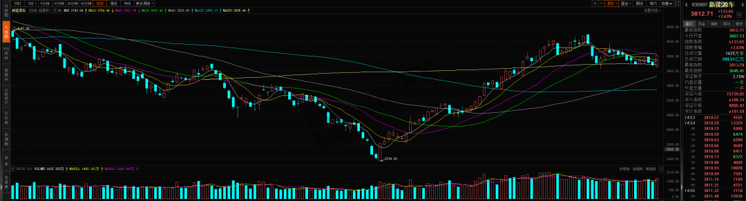 目前市场逐步适应经济下行期的现实,表现在继续围绕高确定性、高景气度的新能源赛道寻找机会。恰逢新能源汽车再次迎来利好,今日调整近一个月的整车、电池、上游材料,尤其是板块中的权重股出现集体回暖,对市场的带动效应也相当明显,但美中不足的是,市场依旧是缩量反弹。