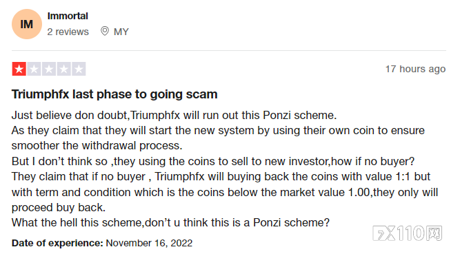 早在2020年12月,FX110网便在《爆!TriumphFX德汇竟以传销模式运营,公众号前身是OTM奥美托管》一文中分析得很清楚了,TriumphFX实质上就是一拆东墙补西墙的资金盘!借用该篇文章里的一句话:“你永远要相信:没有免费的午餐,没有天上掉馅饼的便宜。”而不管它玩出什么花样,资金盘就是资金盘,只要没有新的资金进去,势必就会崩盘,而这,只是时间早晚的问题,望广大投资者深思!