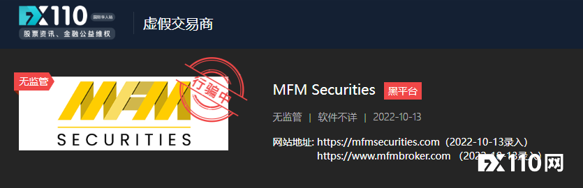 另外,FX110还曝光了MFM Securities平台的另一网址https://www.mfmbroker.com,并将MFM Securities纳入了虚假交易商名单。