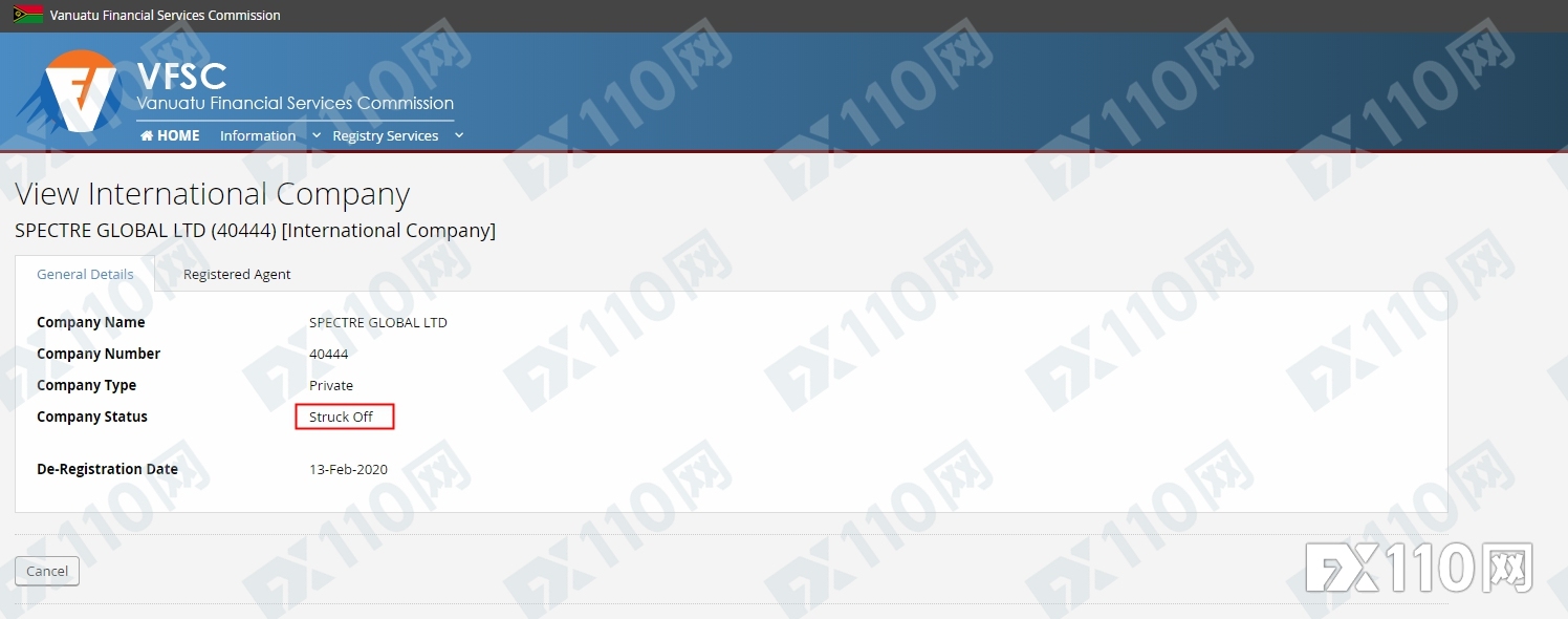 我们在瓦努阿图注册链接输入公司注册号:40444,查询到对应平台为:SPECTRE GLOBAL LTD,公司状态为:已除名,且有注册不代表有监管。也就是说,SPECTRE. AI平台是没有任何监管的黑平台!