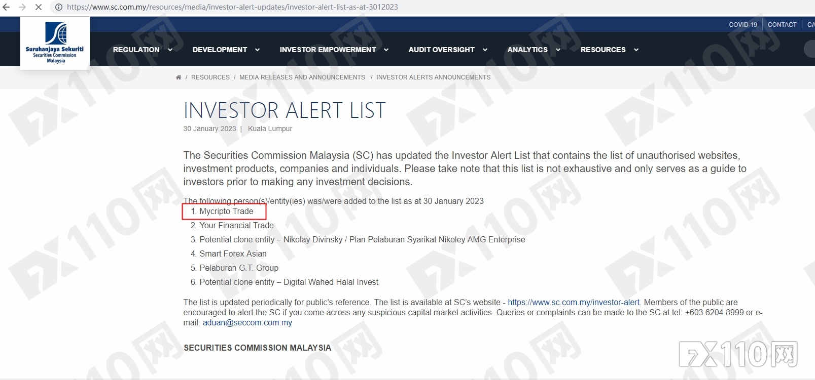 事实上,早在今年1月底,Mycripto trade已被马来西亚证券委员会 (SC)列入了投资者警示名单,大家注意避坑!