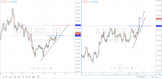 黄金天图:目前行情继续保持多头方向,短期价格在回测关键区域后再度起稳上行,并且有效突破水平压制带1799.438附近。同时也有效打开上方多头空间,从日内4小时级别,其价格上行突破力度较大,不宜追多行情。可适当关注价格调整后的多头机会,目标位置可参考1857.324附近。