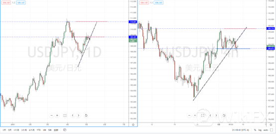 美日天图:短期价格继续处于在关键位置附近徘徊中,下方有上升趋势线的支撑作用,但上方有水平压制带在109.307附近。近期趋势动能不足,从日内4小时级别,价格在跌破短期水平支撑带后起稳,但上方有上升趋势线的反压作用。近期可适当关注价格在关键支撑调整后的表现。
