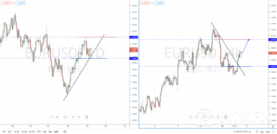 欧美天图:短期价格在下方支撑带1.19865附近再次反转上行,由于因美元指数的反复性,欧美再次形成多头方向。下方有上升趋势线的支撑作用,从日内4小时级别,价格坚决突破上行。可适当关注其趋势调整后继续上行的多头机会,上方目标位置参考1.21079附近。
