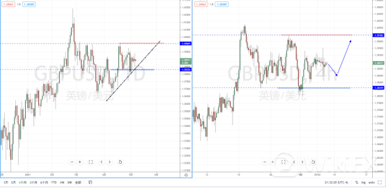 镑美天图:目前行情维持调整不变,整体格局继续保持多头方向。下方有上升趋势线的支撑作用,其水平支撑带1.38325附近。从日内4小时级别,其趋势处于在宽幅区间内调整,可适当关注价格回测下方支撑带在起稳后在多头机会,目标位置可参考前期高点附近。