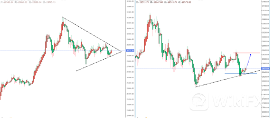 恒生指数天图:目前行情继续处于在收敛状态中,整体趋势趋于偏多阶段中。由于近期趋势即将抉择方向,可适当静等最终的方向确认。从日内4小时级别,价格在回测下方支撑稍微起稳,但需要进一步确认,上方区间目标位置可参考29426.77附近。