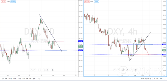 美元指数天图:短期价格在冲击上方压制带附近再次受阻承压,并且形成新的压制点。现阶段整体格局处于偏空阶段中,上方有下降趋势线的压制作用,其水平压制带在91.282附近。从日内4小时级别,价格在承压后跌破上升趋势线,与重要支撑带。可适当关注趋势调整后继续走弱的空头机会,下方目标位置参考90.689附近。