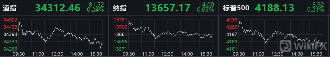 当地时间5月25日,美股三大股指小幅收跌。道指跌0.24%,报34312.46点;标普500指数跌0.21%,报4188.13点;纳指跌0.03%,报13657.17点。