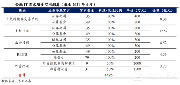 2019-2020年,恒生电子下游主要客户公募基金、券商行业收入持续提升,叠加科创板推出、创业板注册制等多项资本市场改革政策频出,恒生电子下游客户IT预算持续提升。2021年,买方+卖方市场需求预计超过2019年科创板改革需求以及2020年创业板改革需求,增量市场空间约37亿元。此外,2021年6月11日贝莱德集团在华公募展业资格正式获批,东北证券认为后续有更多外资进入中国开展公募业务,提升恒生电子客户覆盖面并有望加速国内金融机构系统建设步伐。