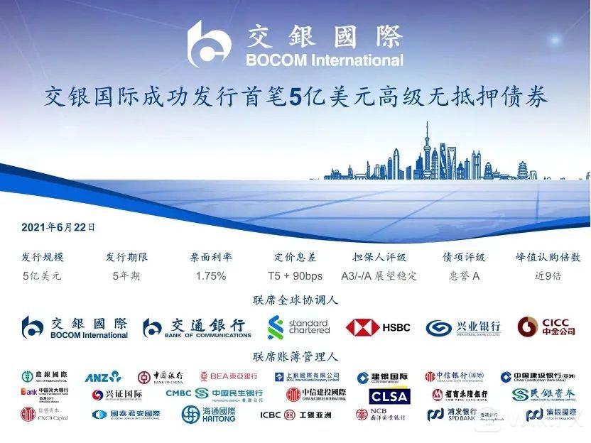 本次发行是交银国际在境外债券资本市场的首次亮相,交易以初始价格指引T5+130基点区间推出市场,最终定价T5+90基点,发行收益率1.763%,最终定价较初始价格指引大幅收窄40基点,簿记峰值近45亿美元,获得近9倍超额认购,创下今年以来香港中资银行系券商债券发行认购倍数最高的纪录,同时亦创历年来香港中资银行系券商5年期债券发行利差最窄的纪录。