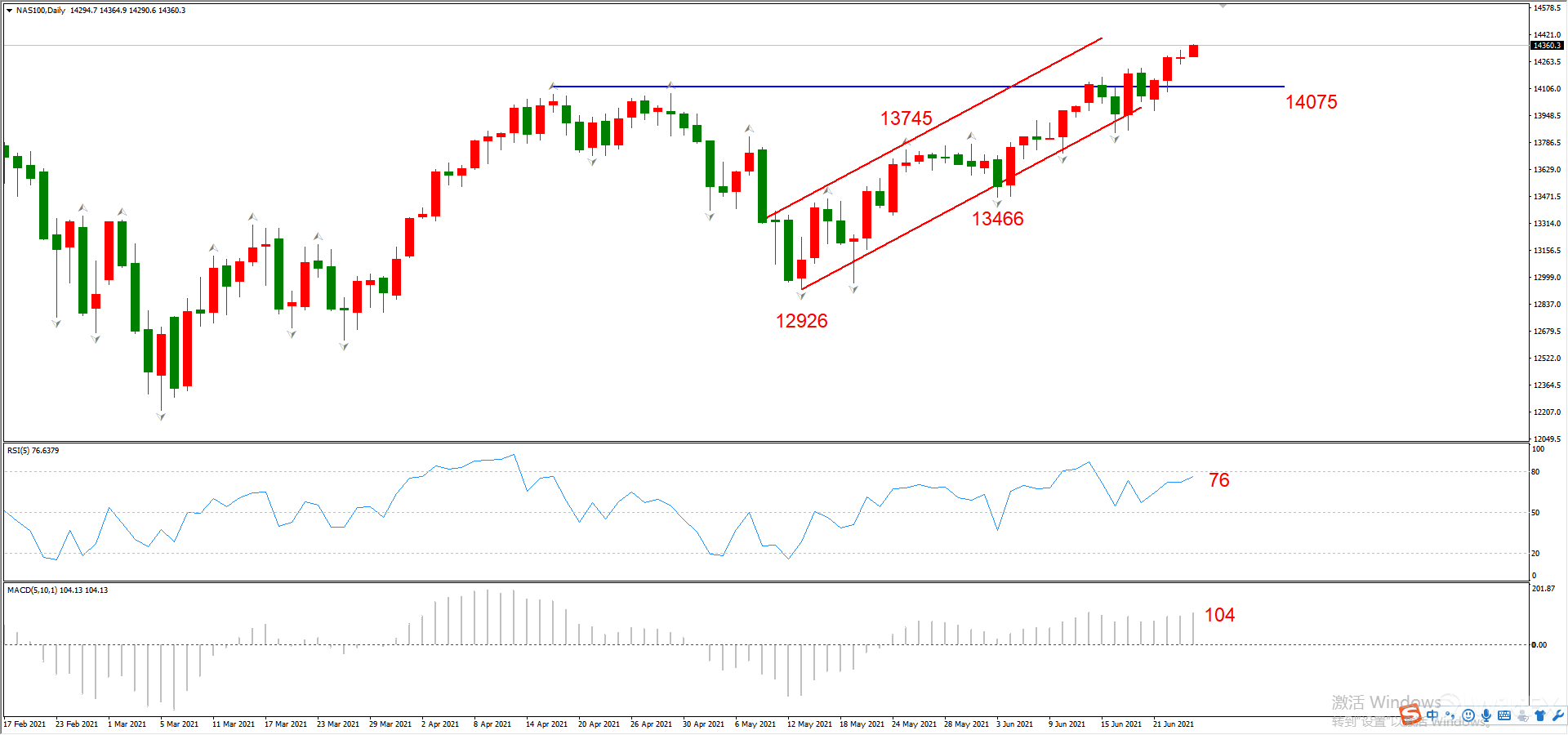 综合判断:14075阻力位已经被有效突破,上方空间较大,预计将维持涨势。宏观面来看,美联储缩减QE预期势必将对美股造成持续性打压,未来长线开启较大幅度下跌是大概率事件。