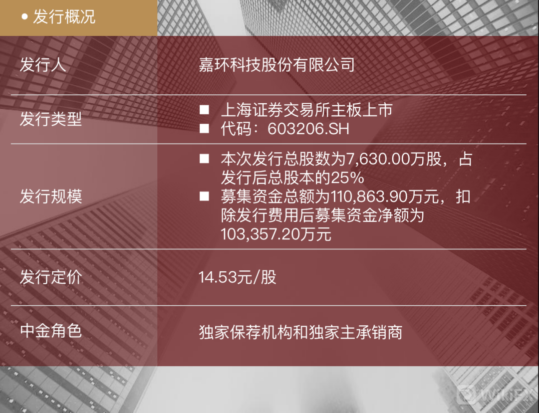 5月6日,嘉环科技股份有限公司(“嘉环科技”或“公司”,股票代码:603206.SH)在上海证券交易所主板挂牌上市,中金公司在本项目中担任独家保荐机构和独家主承销商。