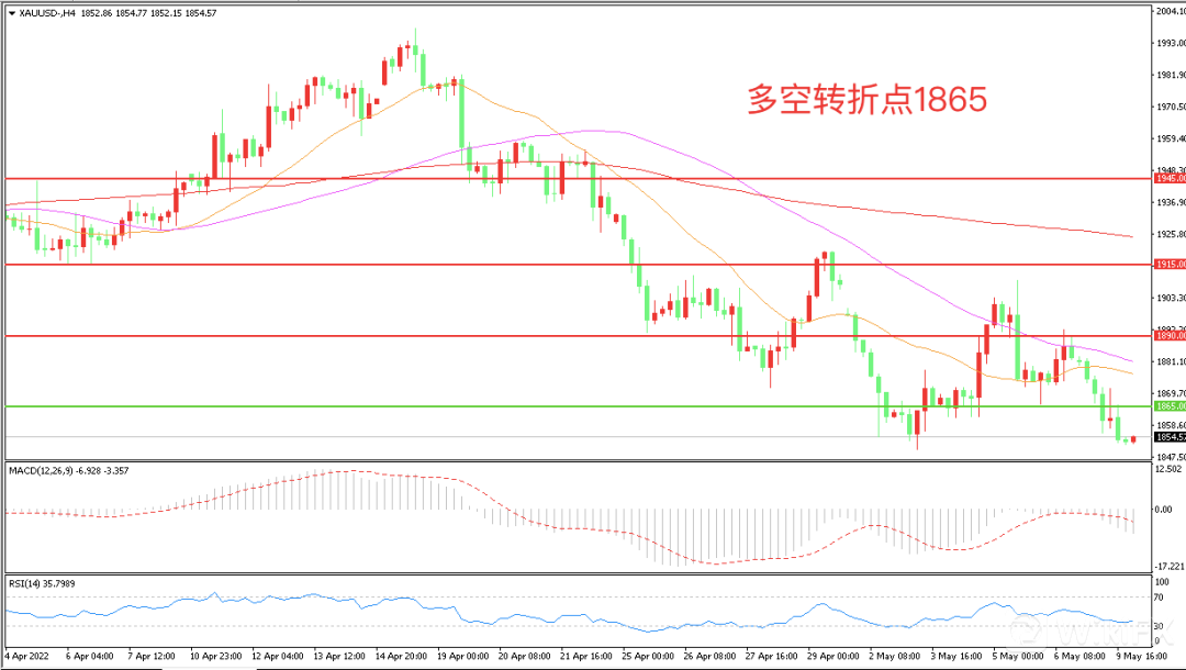 4小时图看,金价连续下跌,整体表现低迷,均线系统呈空头排列,MACD绿柱增加,RSI指标走平,日内震荡下行概率较大。