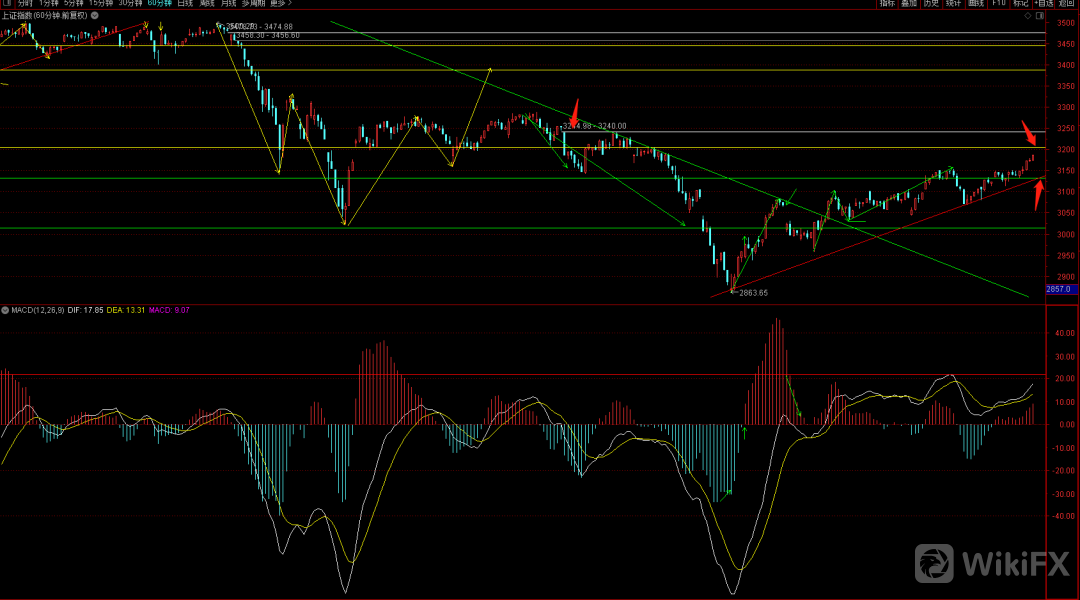 大盘延续上涨一度上攻到3188,短期注意六十分钟的上升趋势线,在没有跌破之前大概率还会有反弹的空间,而上方下一个关卡可能会出现在前期的中枢平台3205到3244这个区间。而日线则需要关注macd的量柱是否能够继续维持扩张。在没有出现收敛之前大概率还不会出现试探3054点支撑的可能。