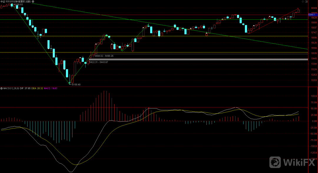 中证500出现扩张上扬,短期注意六十分钟是否会有顶背驰结构的出现,如果能够维持强势上行,则有概率在6100点附近的遇到下一个压制位。而由于日线的三卖结构后续的反弹空间相对可能有限,注意把握好高抛机会。