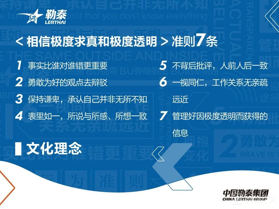 为达成文化原则在“知信行”方面的全面落地,自5月份起,勒泰集团将以主题月的形式践行文化原则,5月份主题为“相信极度求真和极度透明”。值此期间,集团将进行定期的培训、互动、视觉展示等多渠道、多方位、多形式的文化宣贯方式,推进勒泰文化原则落地。